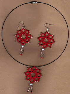 I was just playing around with the thread without even thinking what to make. I ended up making this earring and necklace set in red colored thread with shiny bead. I scanned it with two different backgrounds to see the different effects it give.